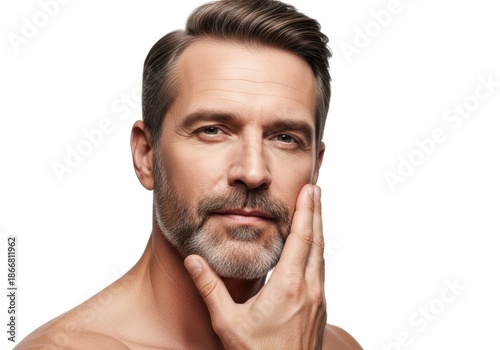 Mature man with short beard touching his face, looking thoughtful and serious, isolated on white background