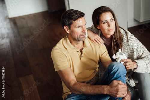 Mature woman holding elephant stuffed toy while day dreaming with man in apartment