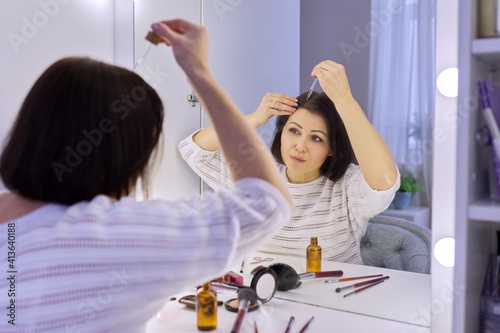 Mature woman treating caring for hair using cosmetic and medical products