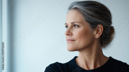 mature woman with a focused look is seen in profile, her gaze directed towards the camera in a minimalist white studio setting. The simplicity of the background emphasizes her expr