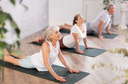 Mature women of different year practice yoga and Pilates in virabhadrasana pose in the gym