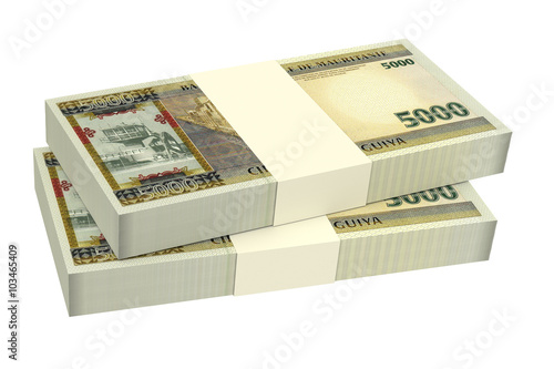 Mauritanian ouguiya bills isolated on white background. Computer generated 3D photo rendering.
