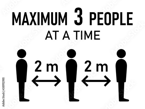 Maximum 3 People at a Time and Keep a Safe Distance of 2 m or 2 Metres Warning Sign. Vector Image.
