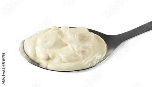 Mayonnaise in metal spoon isolated on white, top view