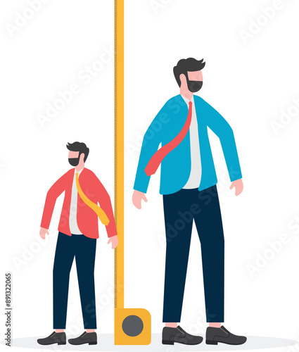 Measuring, two businessmen stand sideways on both sides of the ruler