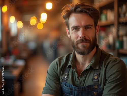 Mechanic in casual workwear standing confidently during sunset with a blurred background of a bustling workshop