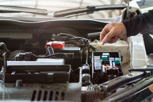 Mechanic man holding standard fuse of the car forchecked, repair and maintenance.