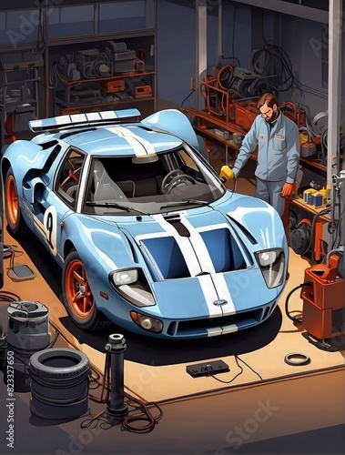 Mechanic repairing a blue sports car in auto repair service station. Generative AI.