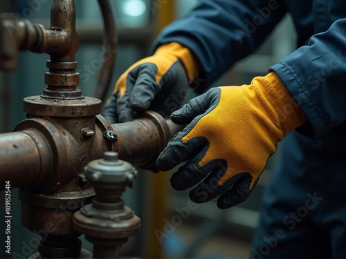 Mechanic repairing rusty industrial pipe with gloves