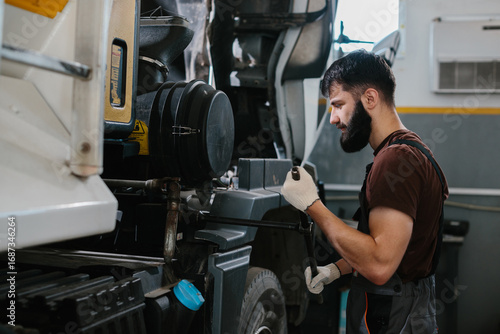 Mechanic repairing truck engine in garage workshop