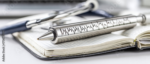 Medical Close-Up: Stethoscope and Pen on Opened Notebook