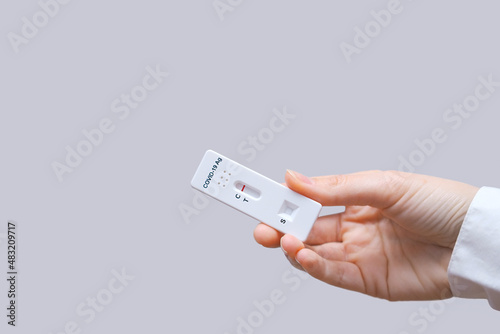 Medical Covid Salival Rapid Test In Human Hand. Positive Result. Quarantine. Text Space