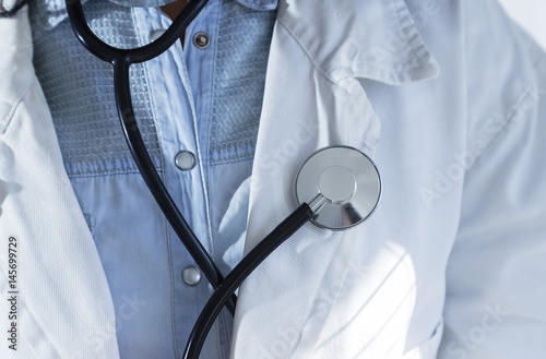 Medical doctor in white gown on white background holding a stethoscope. Focus on the stethoscope.