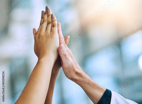 Medical, people and hands or high five in hospital for healthcare success, teamwork and celebrate mission goal. Group, employees and partnership, support and team building motivation of clinic care