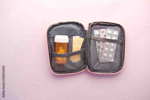 medical pill container, blister pack and bandage in a small bag