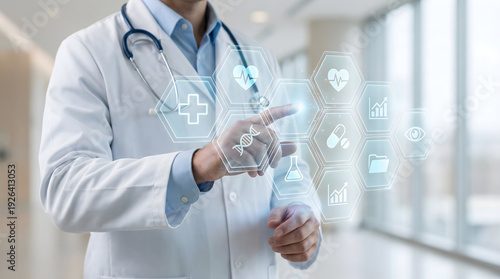 Medical Professional Using Futuristic Holographic Dashboard for Patient Care