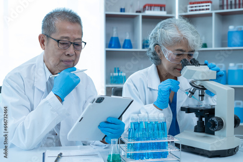 Medical Research Laboratory: Two scientists working, using digital tablets, analyzing samples, talking, developing biotechnology.