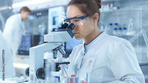 Medical Research Scientists Looking at Samples Under Microscope. She Works in a Bright Modern Laboratory.