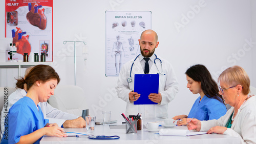 Medical staff listening to lecture, asking questions and taking notes at medical conference sitting in hospital meeting room. Group of physicians talking about symptoms of disease in clinic office