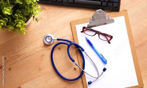 Medical stethoscope lying on a computer keyboard, documents