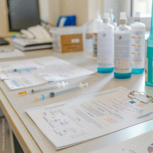 Medical supplies and documents arranged on a workstation in a healthcare setting