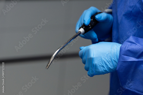 Medical theme, female hands wearing gloves and a surgical gown, holding a saliva ejector, dentistry.