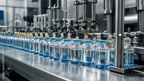 Medical vials on production line at pharmaceutical factory, pharmaceutical machine glass views.