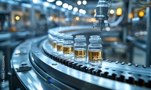 Medical vials on production line at pharmaceutical factory, Pharmaceutical machine working pharmaceutical glass bottles production line, Generative AI