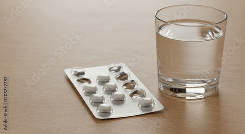 Medicine pills in blister pack next to glass of water on table