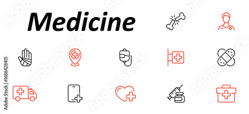 Medicine set icon. Hands, syringes, ambulances, hospital signs, infusion bags, bandages, doctor avatars, mobile apps, cross hearts, and gears in outlined emergency visuals.