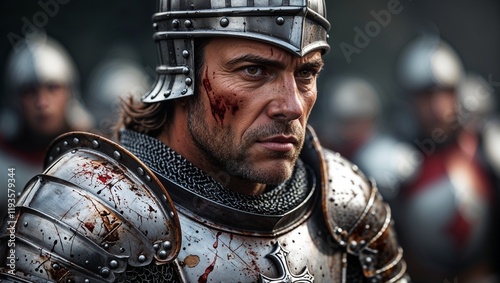 Medieval Knight in Battle Armor with Bloodstains and Cross Emblem