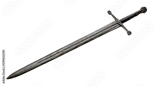 Medieval sword with ornate hilt and weathered blade on display isolated on transparent background