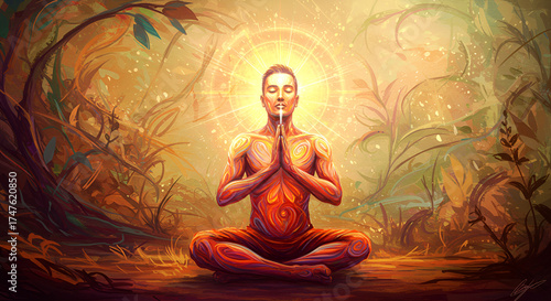 Meditative Person Sitting Cross Legged in Forest with Glowing Aura and Warm Colors
