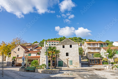 Mediterranean Stone Village Square With Historic Buildings Under Bright Blue Sky and Palm Trees, Stomorska, Croatia