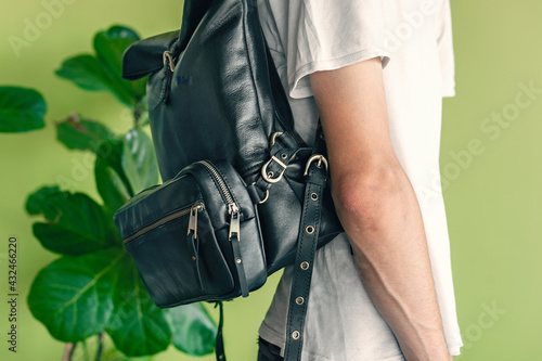 Medium Leather Backpack Rolltop Leather Rucksack Bag. Young guy is wearing a white T-shirt and a black leather backpack.