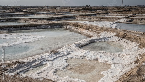 Medium shot capturing unlined solar evaporative salt ponds with natural earthen banks and varied salt crystallization patterns under diffuse sunlight.