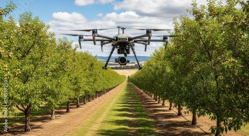 Medium shot of a drone hovering over a tree nut orchard capturing highresolution imagery for yield monitoring and data collection.