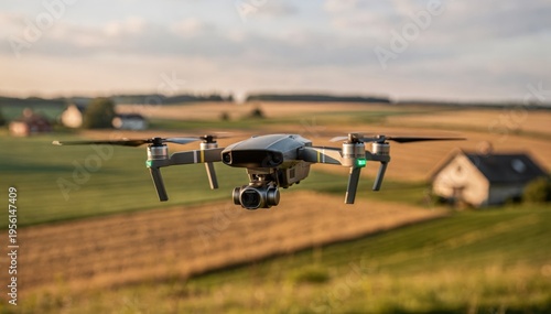 Medium shot of a drone in crisp detail filming a tranquil rural landscape dotted with farmhouses the expansive fields and distant trees softly blurred to highlight the drones