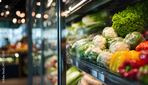 Medium shot of a refrigerated display case with glass doors showcasing fresh produce with crisp details in focus and a softly blurred store interior background.