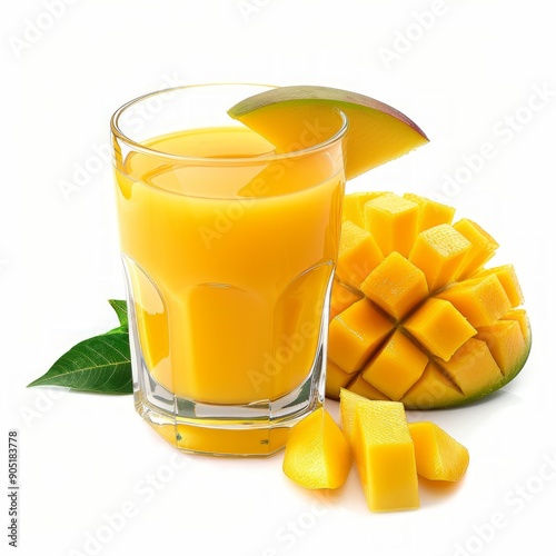 Medium shot of Glass of mango juice near the mango, isolated on a white background