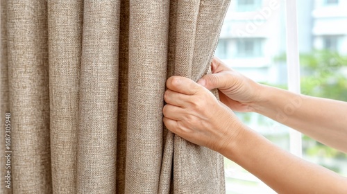 Medium shot of hands adjusting thick wool curtains with blurred background showcasing soundproofing qualities in a cozy living room setting.