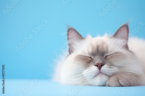 Medium shot portrait photography of a funny ragdoll cat sleeping on pastel or soft colors background