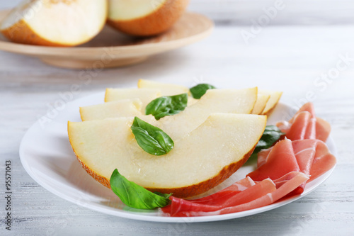 Melon with prosciutto of Parma ham on wooden table, closeup
