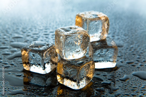 Melting ice cubes on reflective background
