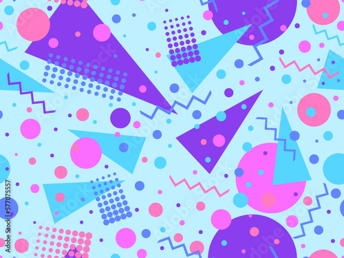 Memphis seamless pattern with geometric shapes in 80s style. Colorful geometric pattern. Design of promotional products, wrapping paper and printing. Vector illustration
