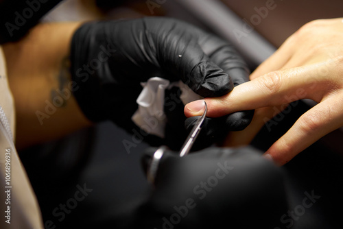Men's manicure. Male hand undergoing a manicure procedure. The master does a man's manicure. A manicurist files a man's nails in a salon. Hygiene and hand care for men. Men's manicure design.