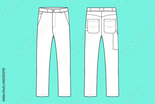 Men's Relaxed Fit Duck Carpenter Pants Fashion Flat Sketch Vector Illustration Template CAD Mockup Front and Back Views.