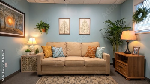 Mental Health Cozy living room featuring a sofa, plants, artwork, and warm lighting in a soothing color palette.