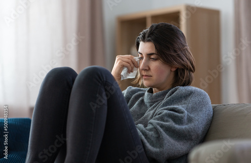 mental health, psychological problem and depression concept - sad crying woman sitting on sofa at home