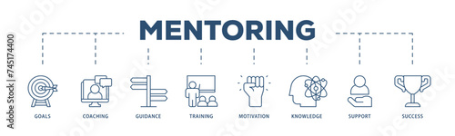 Mentoring icons process structure web banner illustration of goals, coaching, guidance, training, motivation, knowledge, support, and success icon live stroke and easy to edit